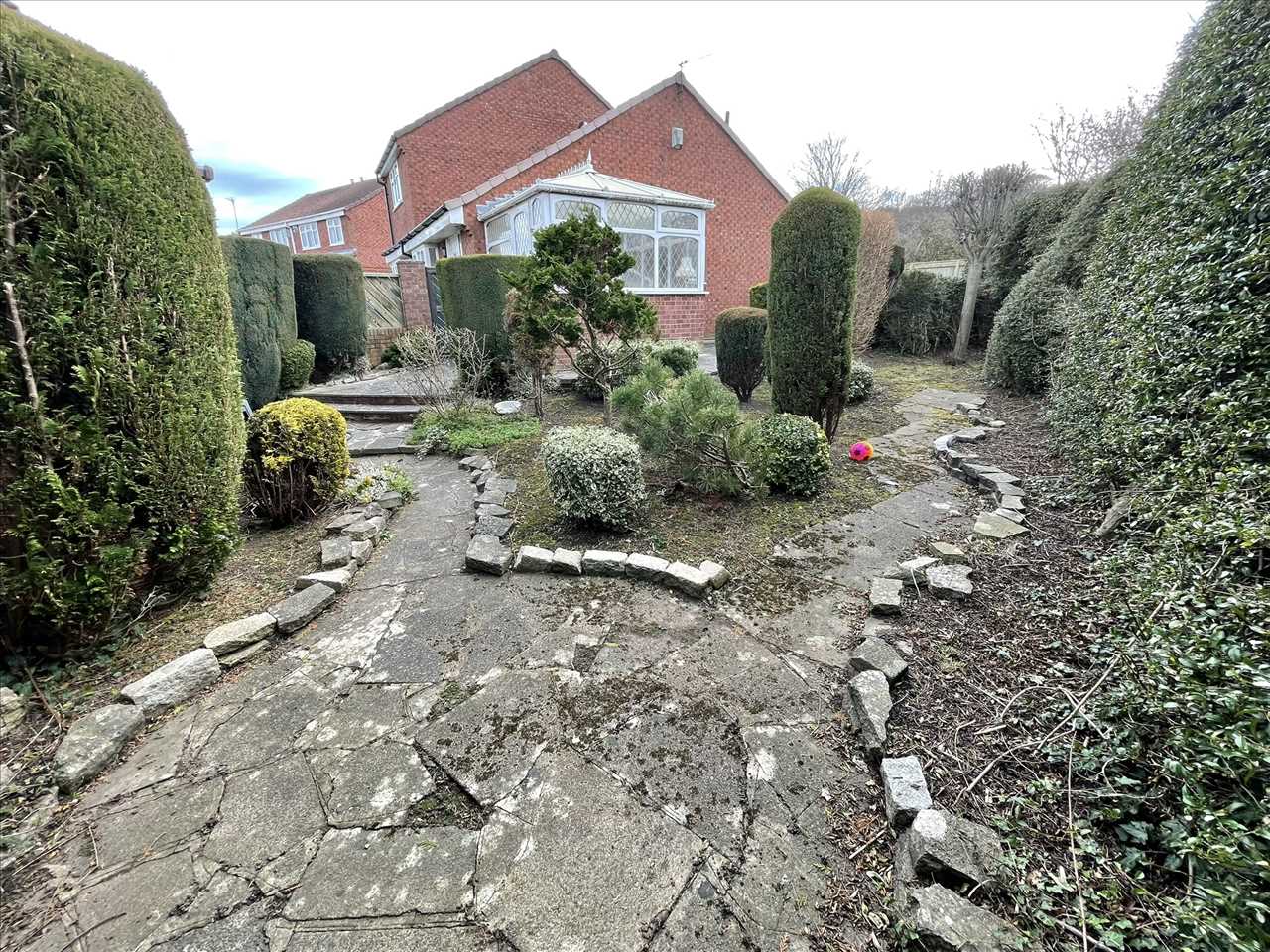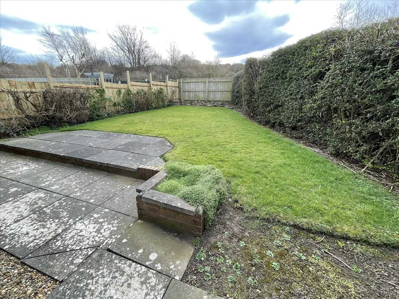 The property is approached by an open plan paved driveway which adjoins the open plan front lawn and single garage. There is also a gate providing access to the side and rear gardens. The side garden is well stocked with shrubs and has a patio area. There is a path leading to the rear lawn which backs onto Cleadon Hills.